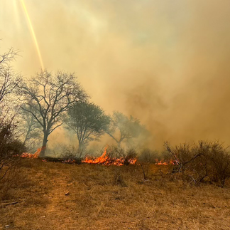Am Sonntagnachmittag landen wir wieder in Skukuza, wir wollen unseren Gästen doch aus eigener Erfahrung erzählen können, was sie bei der Reise zu uns erwartet. Dass direkt neben dem Flugplatz ein riesiger Buschbrand wütet, gehört hoffentlich nur diesmal dazu. Ernst, der Manager des Sabieparks, holt uns ab und macht anstatt einer Wildtierfahrt eine Feuerfahrt mit uns. Es ist immer wieder eindrücklich, zu sehen, wie ein solches Wildfeuer wütet. Nach einer kurzen Besichtigungstour im Haus, nach welcher wir auf einem Tiefpunkt anlangen, weil so schlecht gearbeitet wurde, fahren wir auf den Campingplatz in Skukuza, wo wir vier Nächte gebucht haben – danach war schon alles voll. Am Abend sitzen wir auf der Terrasse des ‘Cattle Baron’ Restaurants, von wo das faszinierende und beängstigende Flackern des Feuers gut zu sehen ist. Mit Schrecken erfahren wir am nächsten Morgen, dass wohl genau zu dieser Zeit das Dach des Flughafen zum Raub der Flammen wurde.